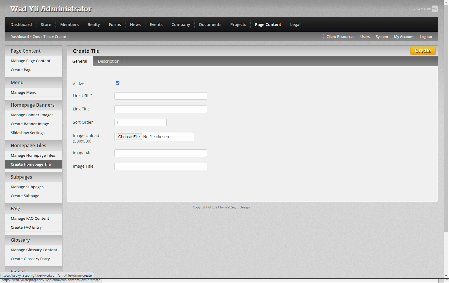 To add a new homepage tile, click “Create Homepage Tile” in the left column.
